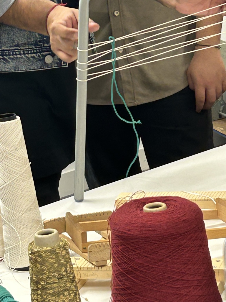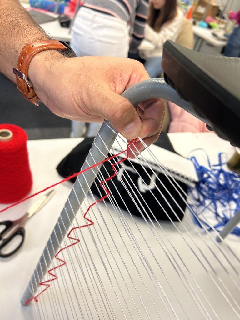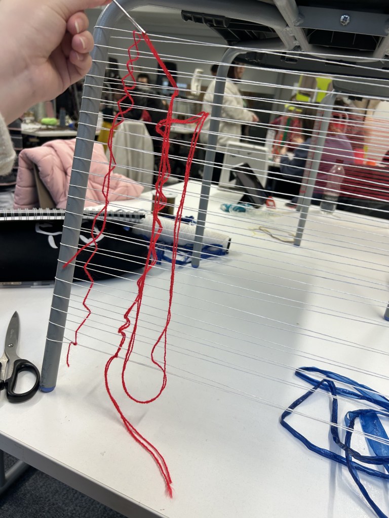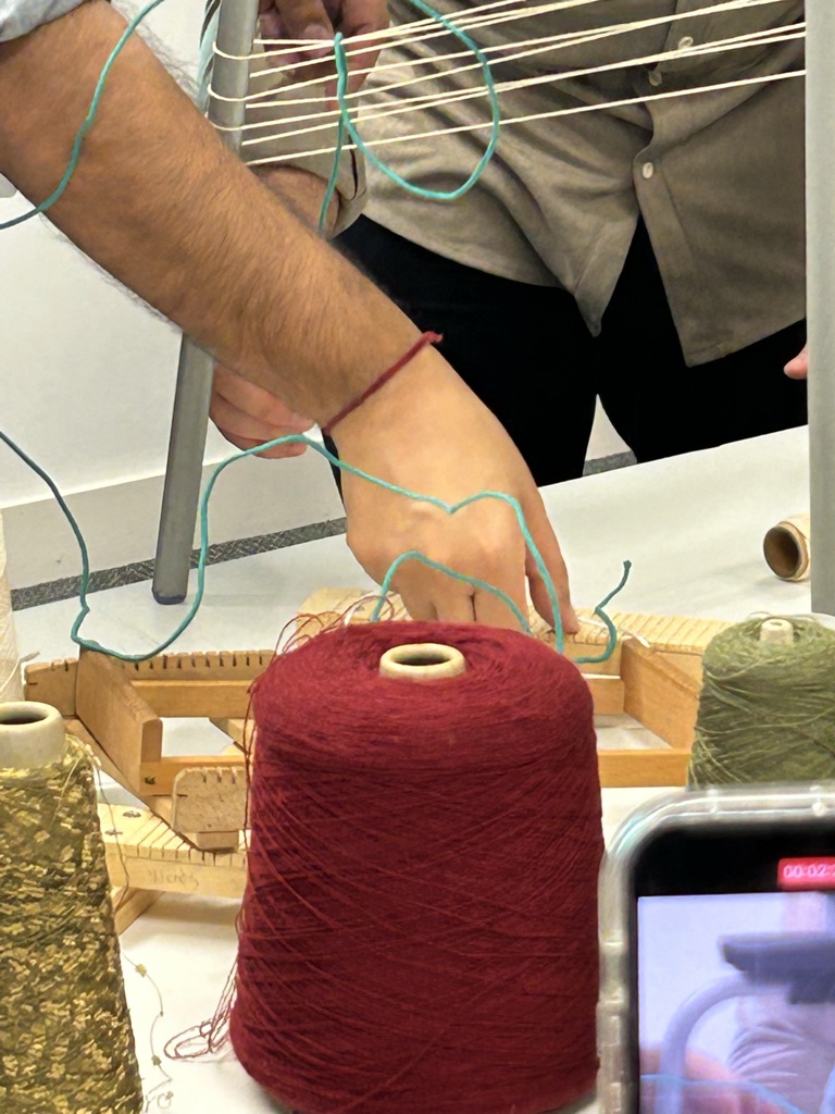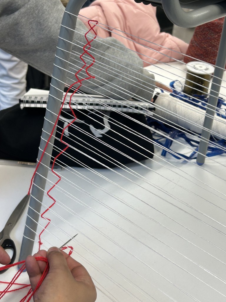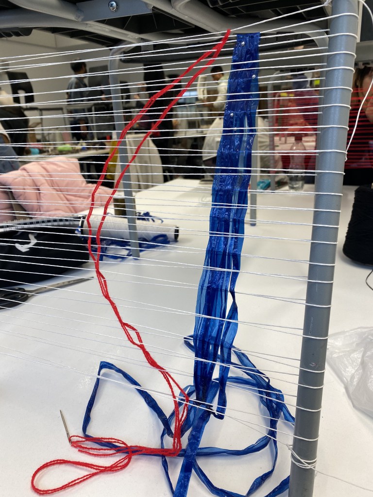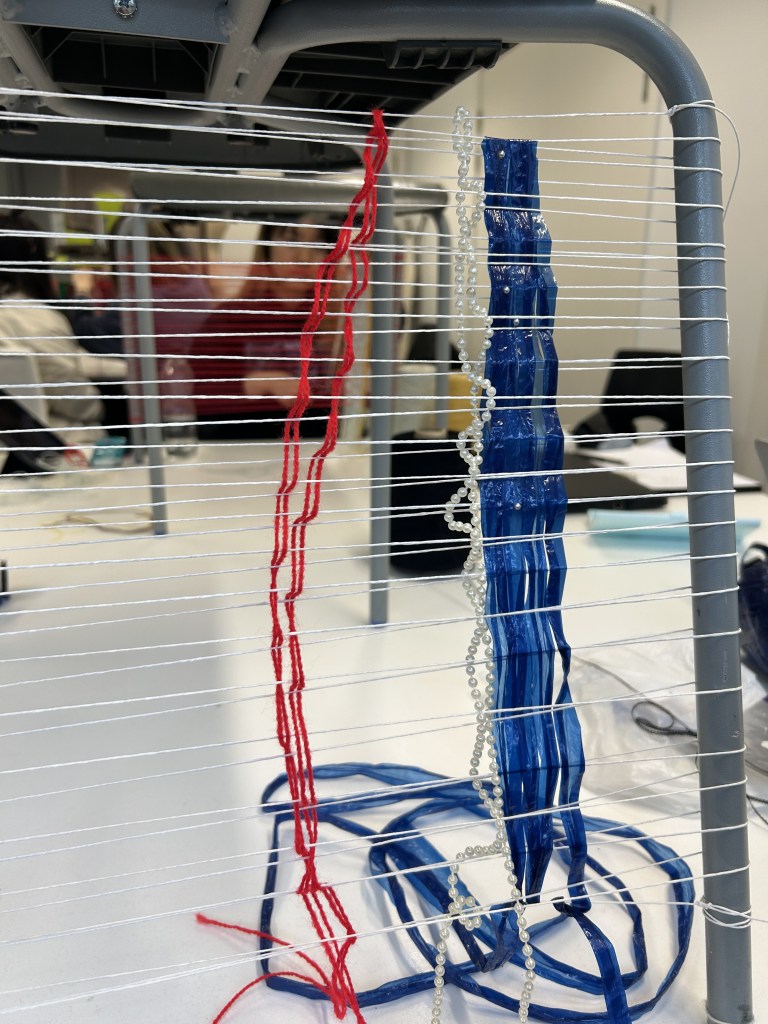 In this class was a very important learning and experimentation process for me. I learnt about the traditional preparation process. And to prepare it with different materials. We chose to use red and blue plastic threads and pearl stickers. When I put the pearls on I found that the traditional weaving was very interesting and went very well with the pearls.