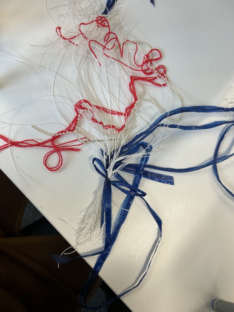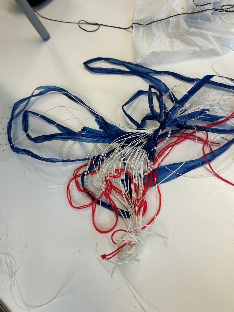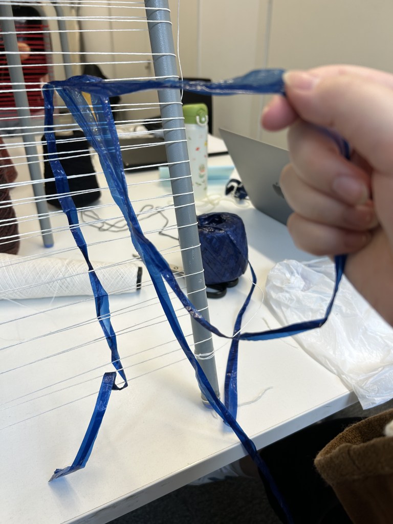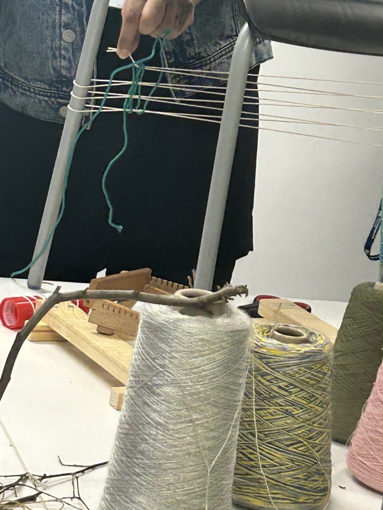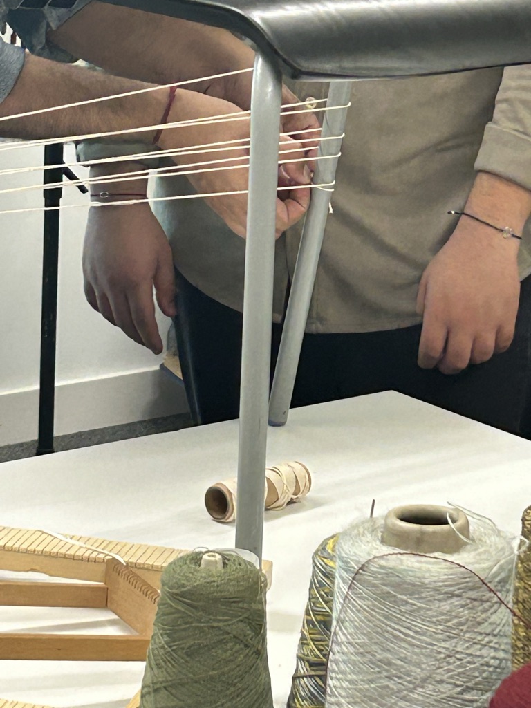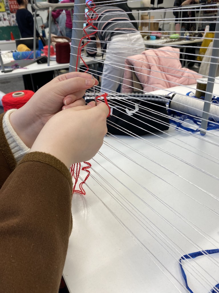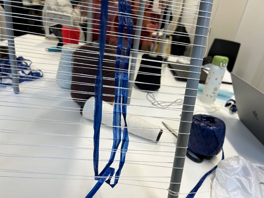 In this class was a very important learning and experimentation process for me. I learnt about the traditional preparation process. And to prepare it with different materials. We chose to use red and blue plastic threads and pearl stickers. When I put the pearls on I found that the traditional weaving was very interesting and went very well with the pearls.