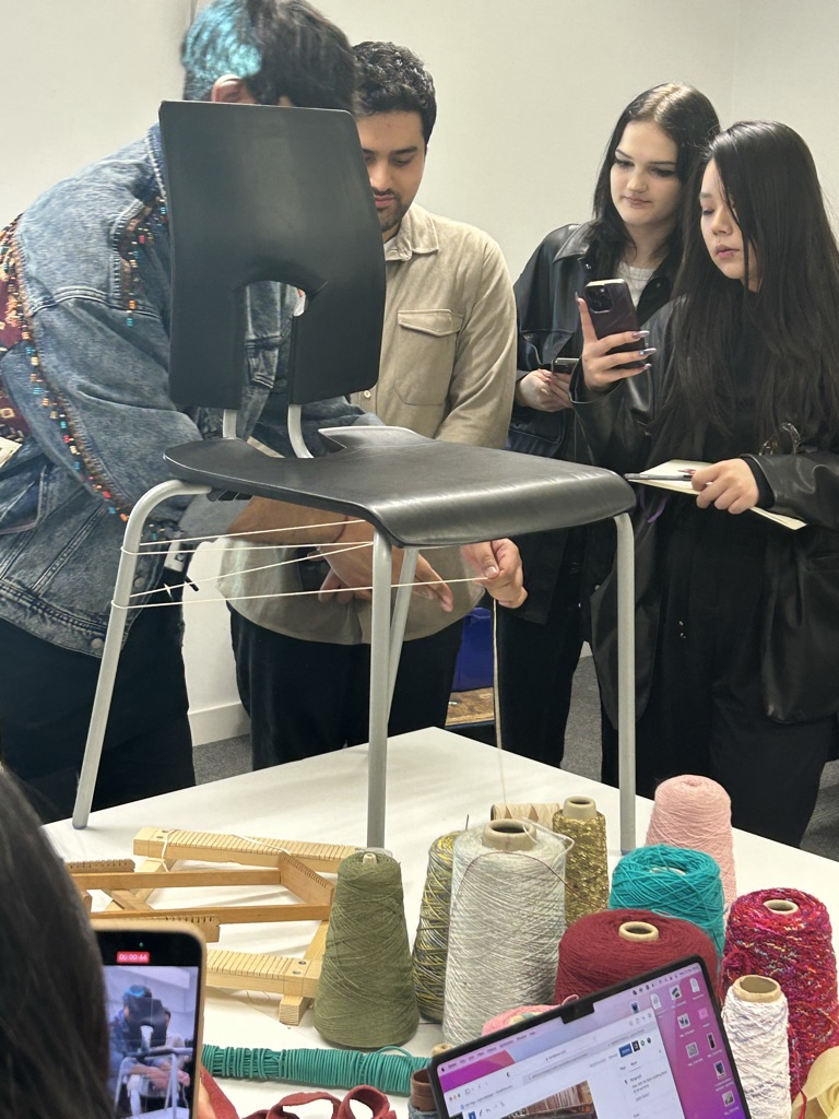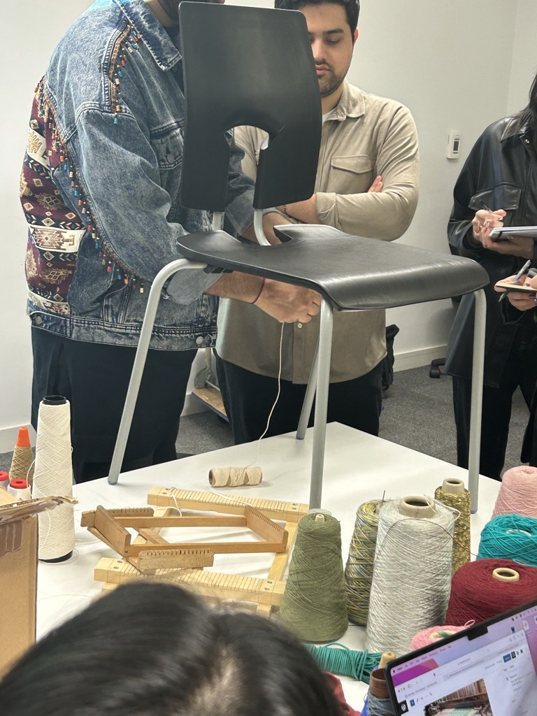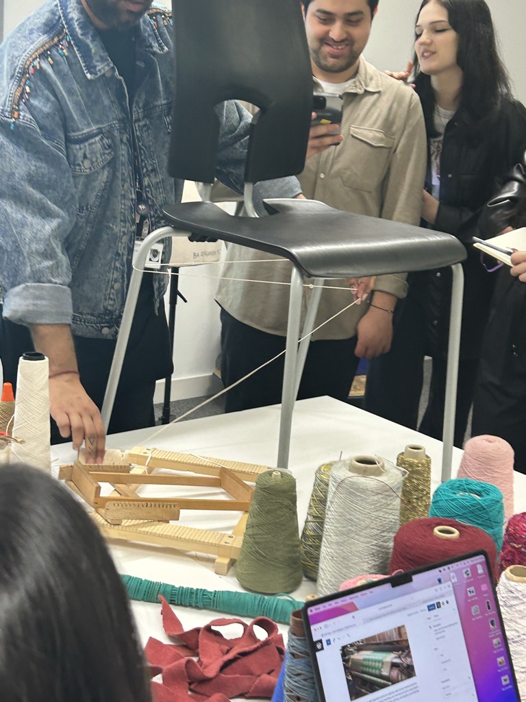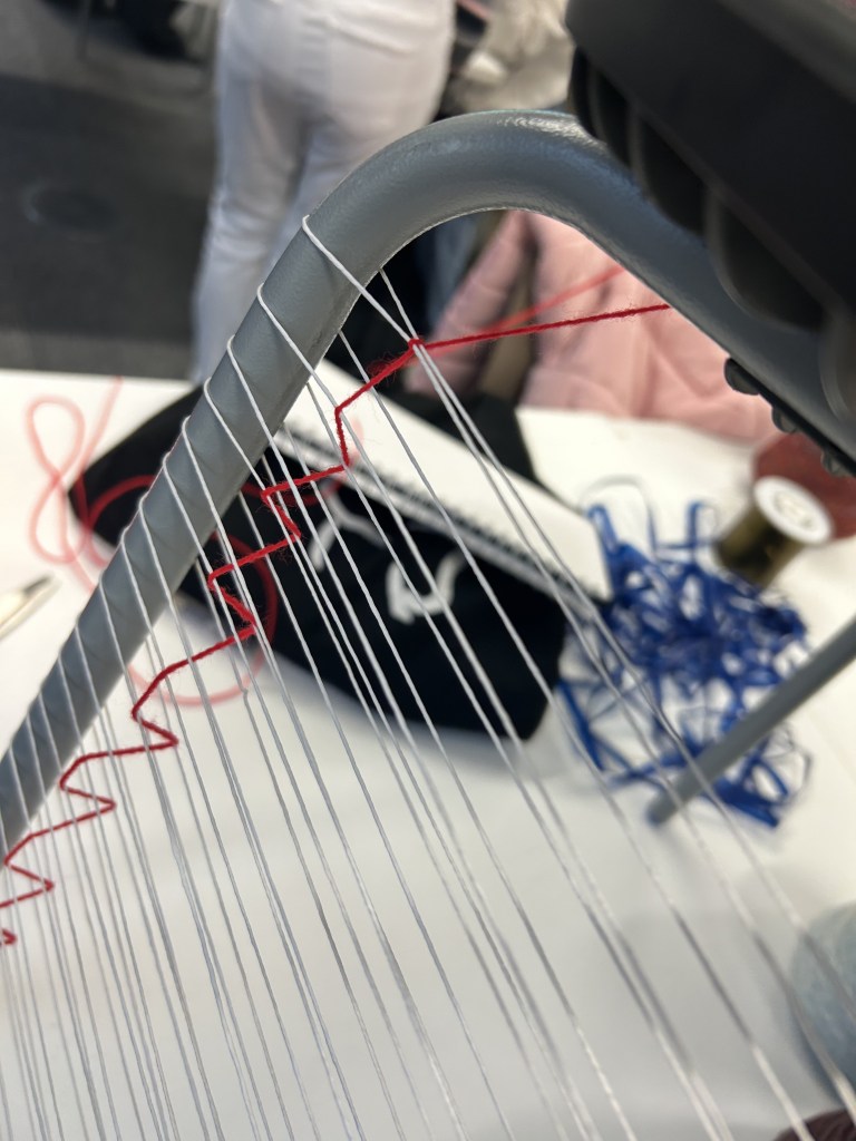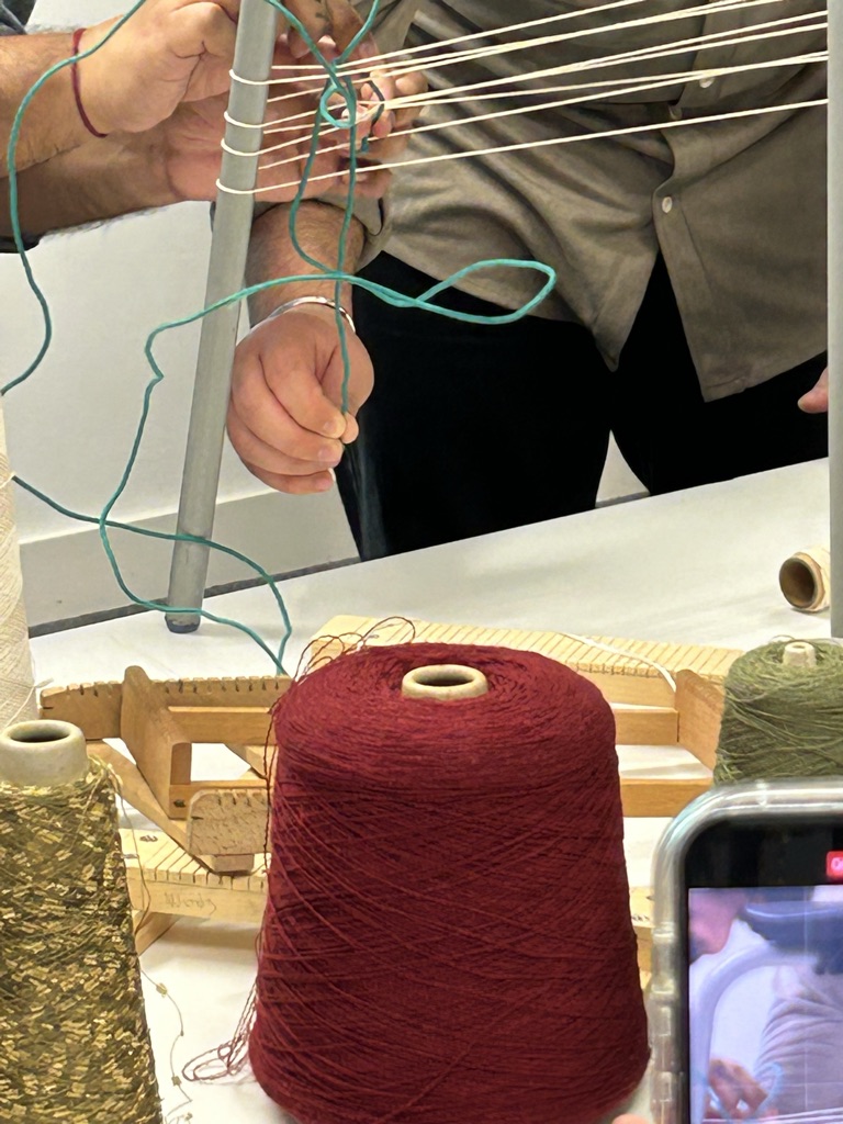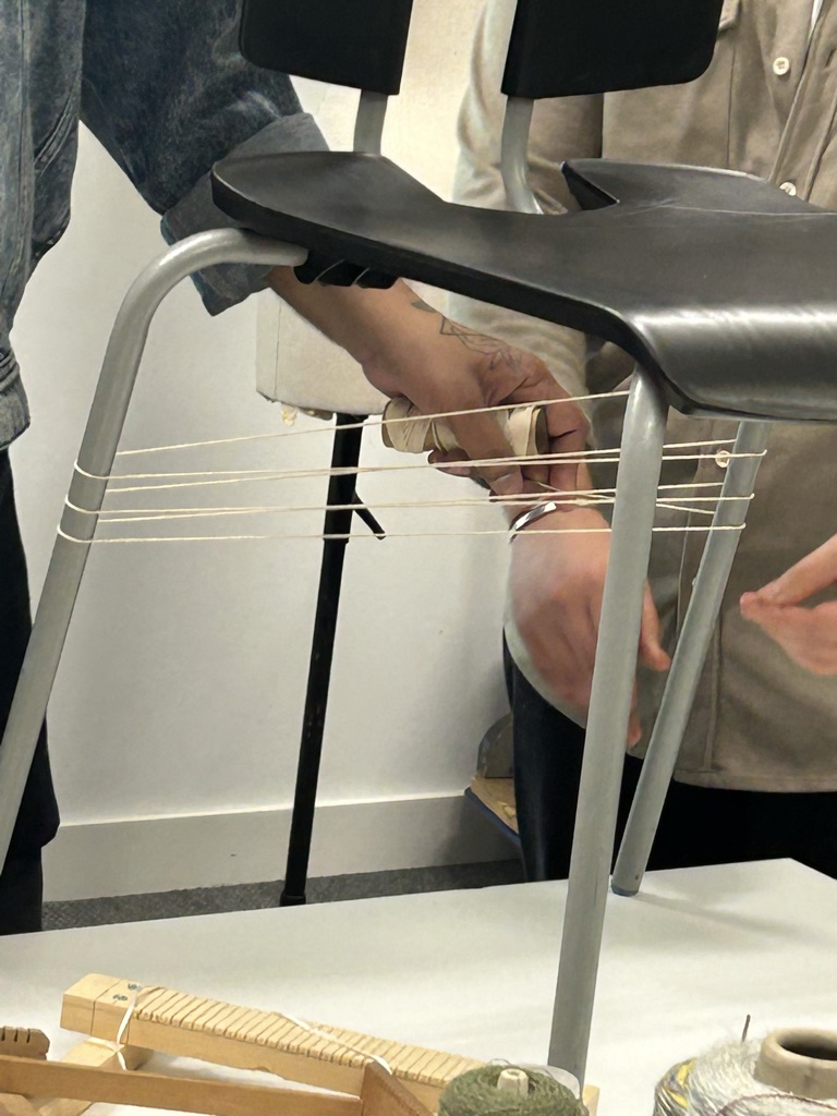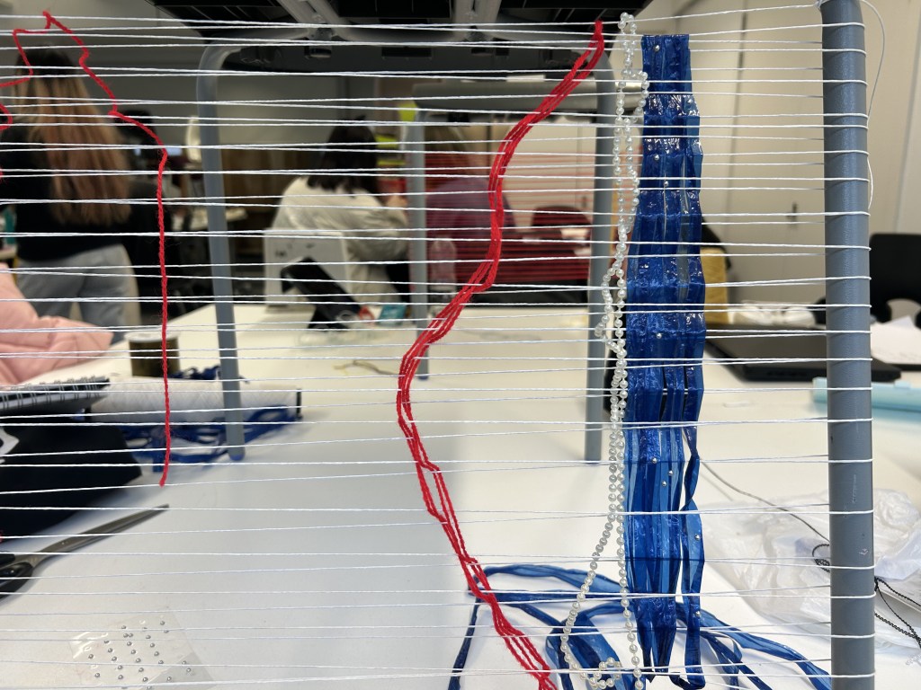 In this class was a very important learning and experimentation process for me. I learnt about the traditional preparation process. And to prepare it with different materials. We chose to use red and blue plastic threads and pearl stickers. When I put the pearls on I found that the traditional weaving was very interesting and went very well with the pearls.