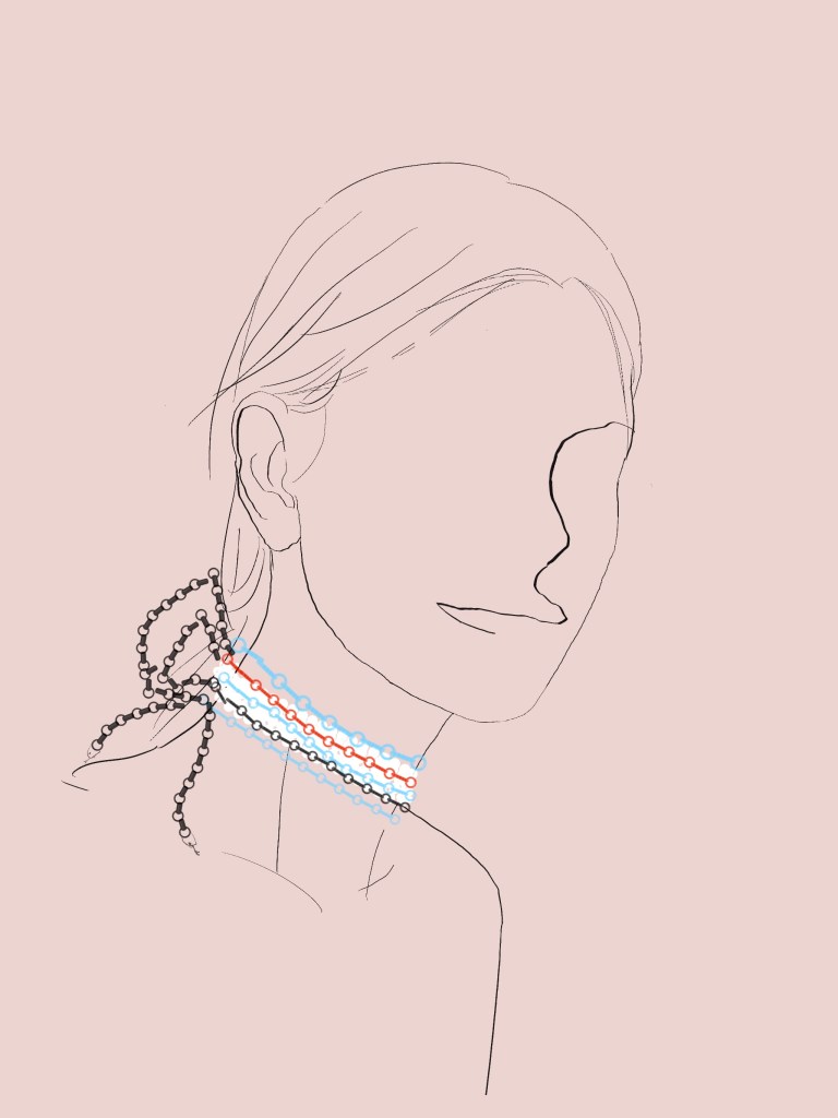 - For the structured necklace, I would like to make it out of clear glass or acrylic. Maybe just glass from a wine bottle. The structure is a state of superimposition. The superimposed combination of one’s own lines and the lines of the human body into a new visual experience. It is created to change a structure. I think I could also try experimenting with changing the material to concave lenses etc. afterwards.
