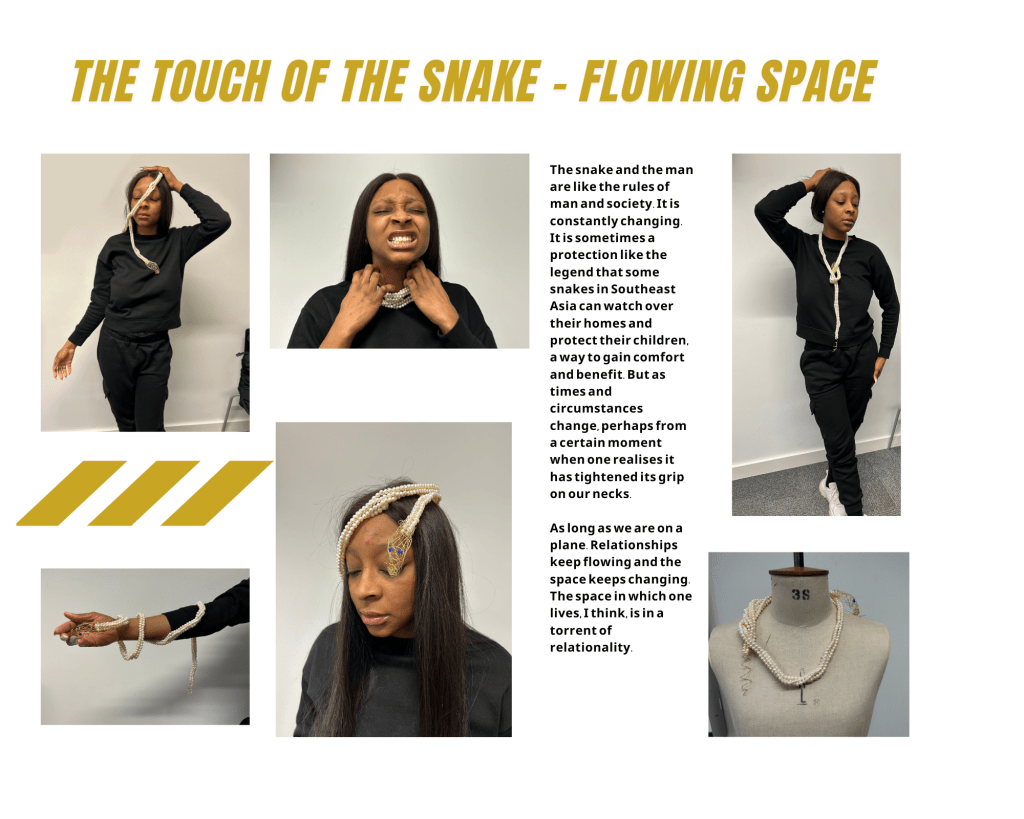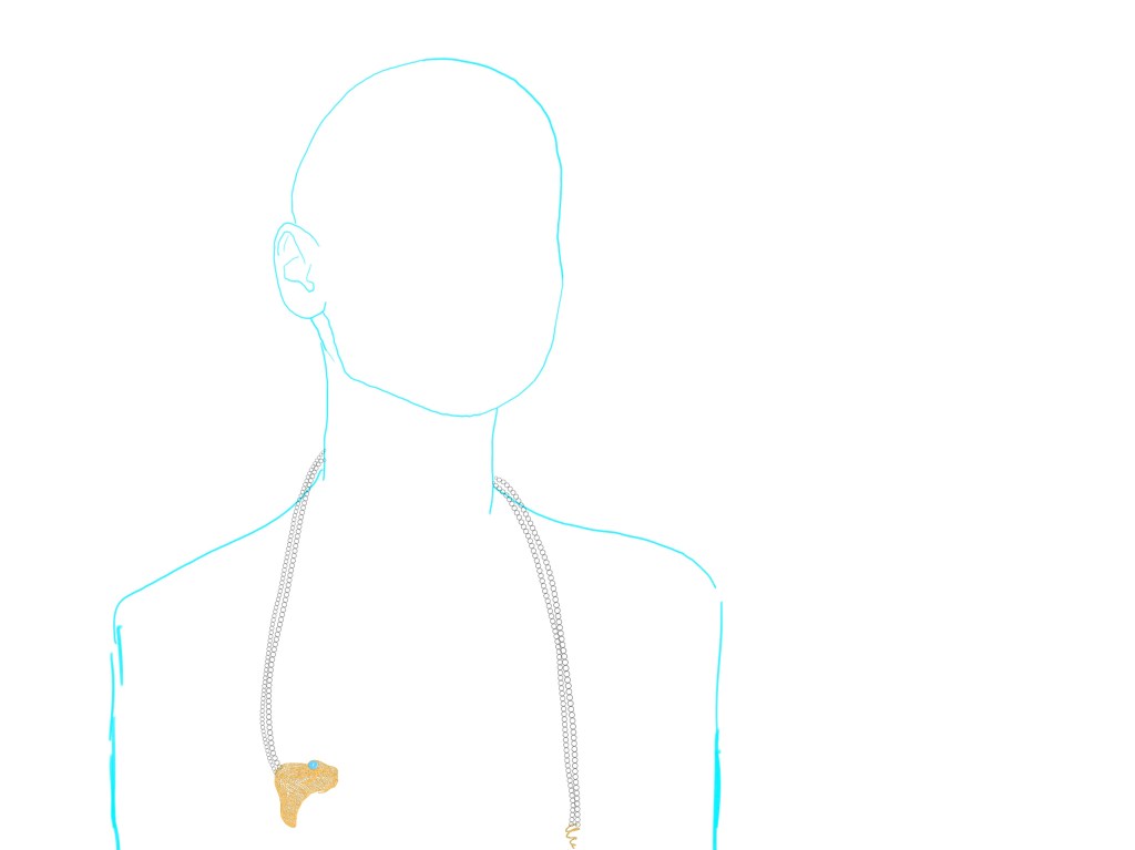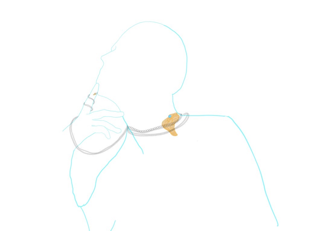 Externally, this ever-changing relationship is like that of a human being and a snake. This was my inspiration for the shape of the necklace, which I wanted to make in the shape of a snake. Snakes are often a source of crisis and constraint for those who don’t know them, and one always associates them with strangling their prey. On the contrary, in some countries, the snake is also depicted in legends as a guardian and protector of the family. This corresponds to the sense of bondage and the benefits and even security that rules bring to people in different spaces and times.