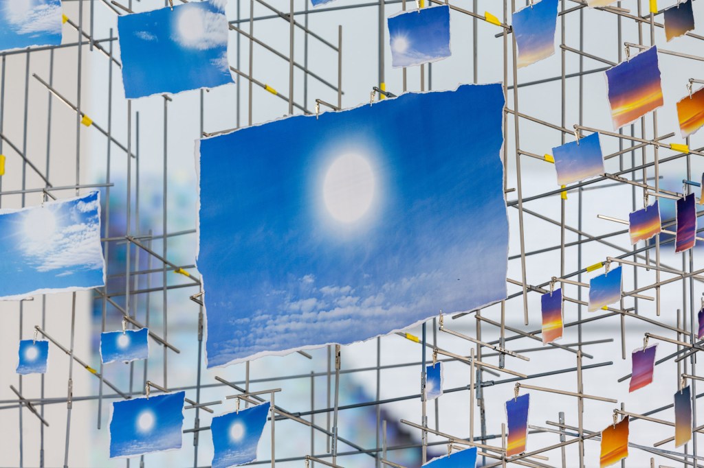 The choice of materials is often driven by the artist’s need for expression, and Sarah Sze tends to use a variety of materials and media to express her ideas. Her choice of materials and the way she uses them is quite subtle. As Bruno Latour puts it ‘Sarah Sze gleans objects and images from the worlds both physical and digital.’ She specializes in constantly jumping between the macro and the micro, delicately using complex three-dimensional structures. She therefore always uses a large variety of materials. The almost metallic sphere of “Night today”, for example, is driven by an exploding line of wooden structures reminiscent of the Big Bang. Destruction, creation, kinetic time, and many other words close to the roots of the world. It is like an exploration of the beginning and end of the world, and like an eternal question to the viewer. She is good at making sharp, clear work out of hard stuff. Of course, she is also very good at making complex and ornate works from more soft or not quite firm and not quite soft enough wire. It’s like a space where time and matter are in complete chaos. “Hidden Relief” is just such a piece. It is made using a great variety of materials of different textures. It uses wire, silk, 3D printing technology, acrylic, light, and shadow effects, and so on. It expresses a room that is hidden in chaos with a touch of order. It creates a sense of peeking through various-sized gaps. Because of her rich and diverse forms of expression, her choice of materials is also rich and delicate. In ‘Shorter than the Day’, she uses several photographs of the sky. Many of them have the sun or sunlight in them. Sarah Sze is flexible in her choice of materials, which makes her work even more attractive.