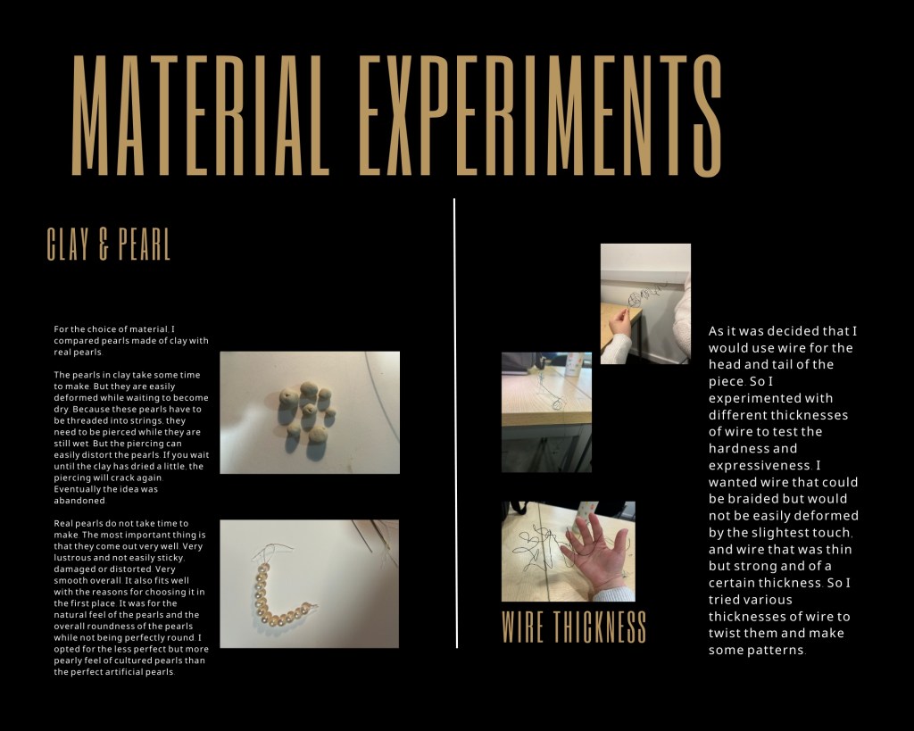 After these 30 drafts were done, I considered this to be an experiment. After the final experiment I think that pearls and metal are the most compatible pairing. Subsequent works will continue in this pattern of materials.