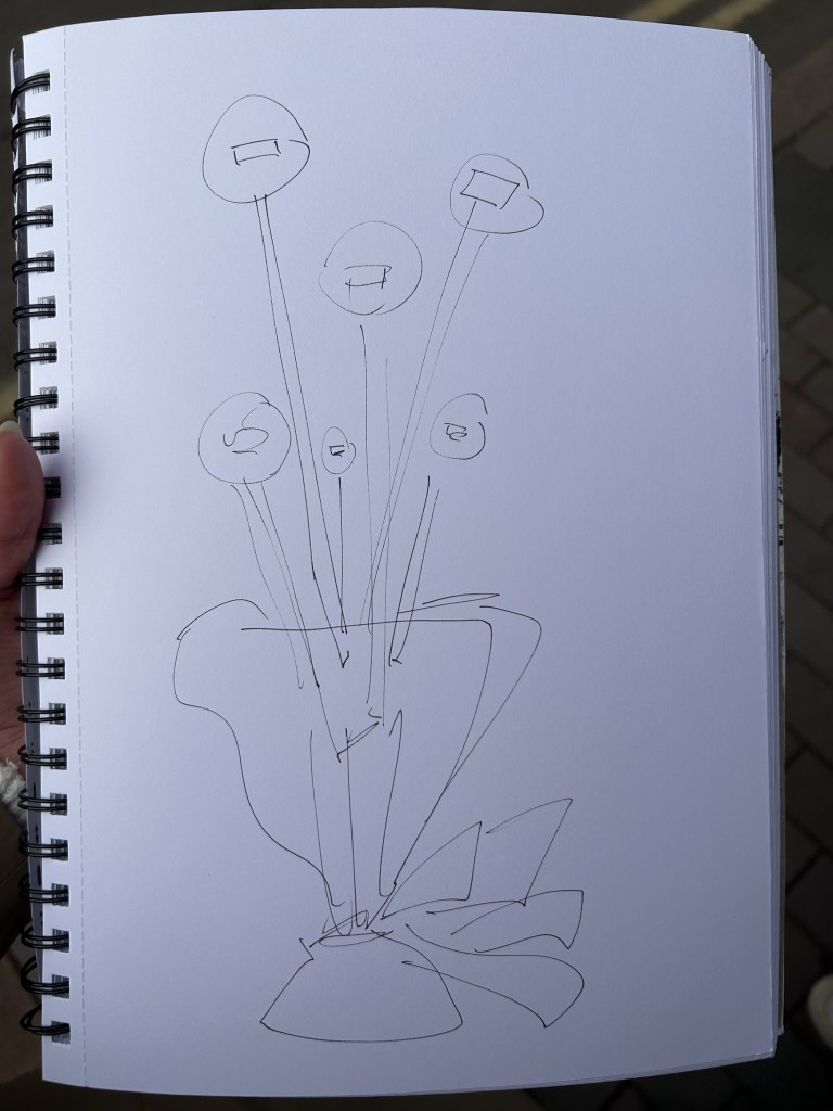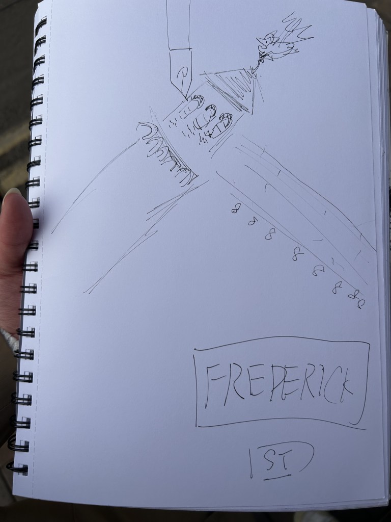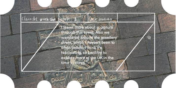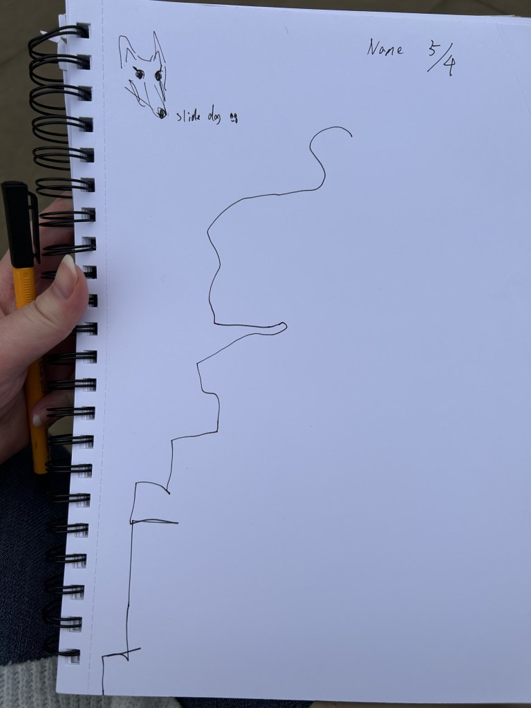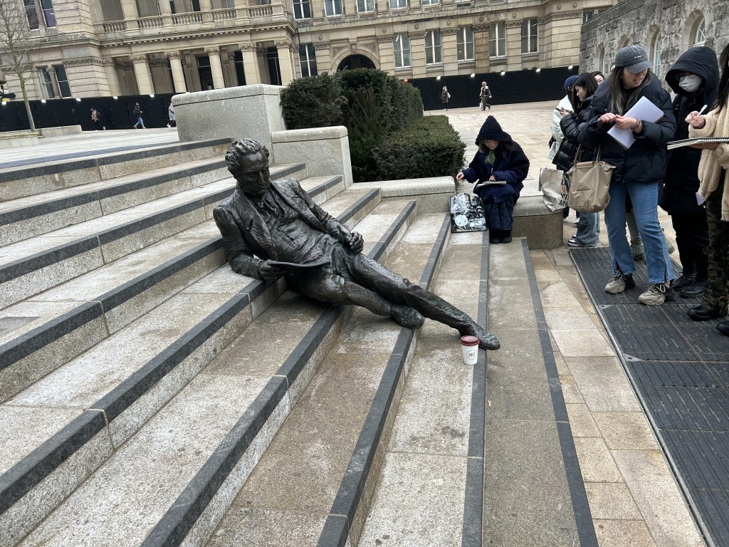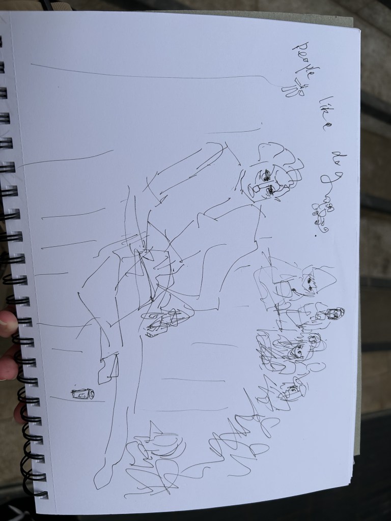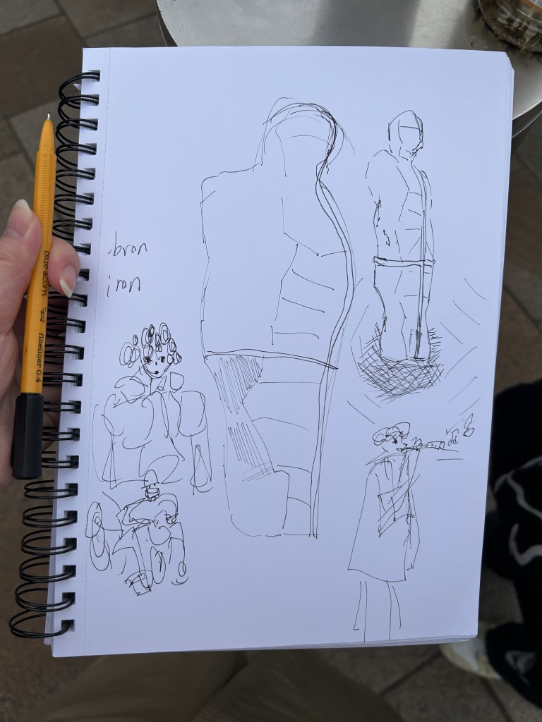 Today we went on an outdoor expedition to see the sculptures and paint them. I tried painting normally and also half of the sides. It was all very interesting. I also spent the rest of the day painting a lot of interesting passers-by. People playing flutes, people with curly hair, people on bicycles and my classmates.