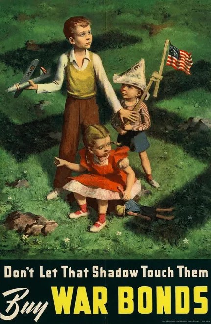 The theme of this poster is to create anxiety by drawing hints that war hurts children. This is to get more people to buy war bonds for their children’s future lives and to get them to support the war financially.
